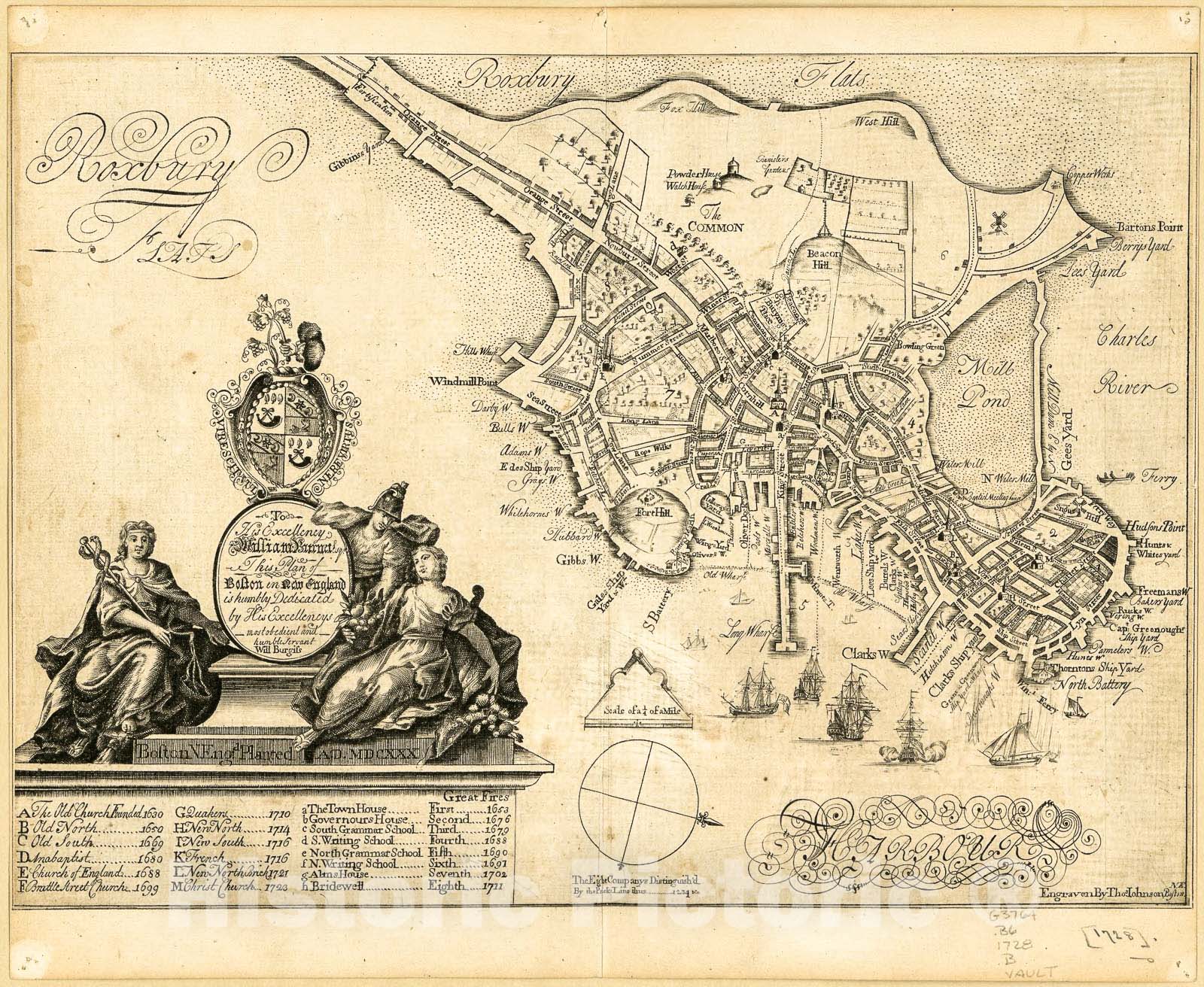 Historic 1728 Map - to his Excellency William Burnet, esqr, This Plan of Boston in New England is Humbly Dedicated by his excellencys Most Obedient and Humble Servant Will Burgiss
