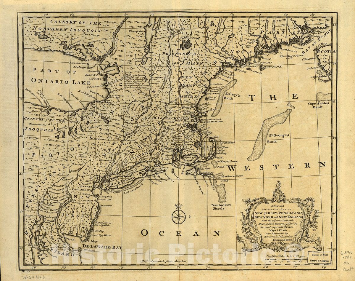 Historic 1747 Map - A New and Accurate map of New Jersey, Pensilvania, New York and New England, with The Adjacent Countries. Drawn from surveys, Assisted by The Most Approved Modern maps