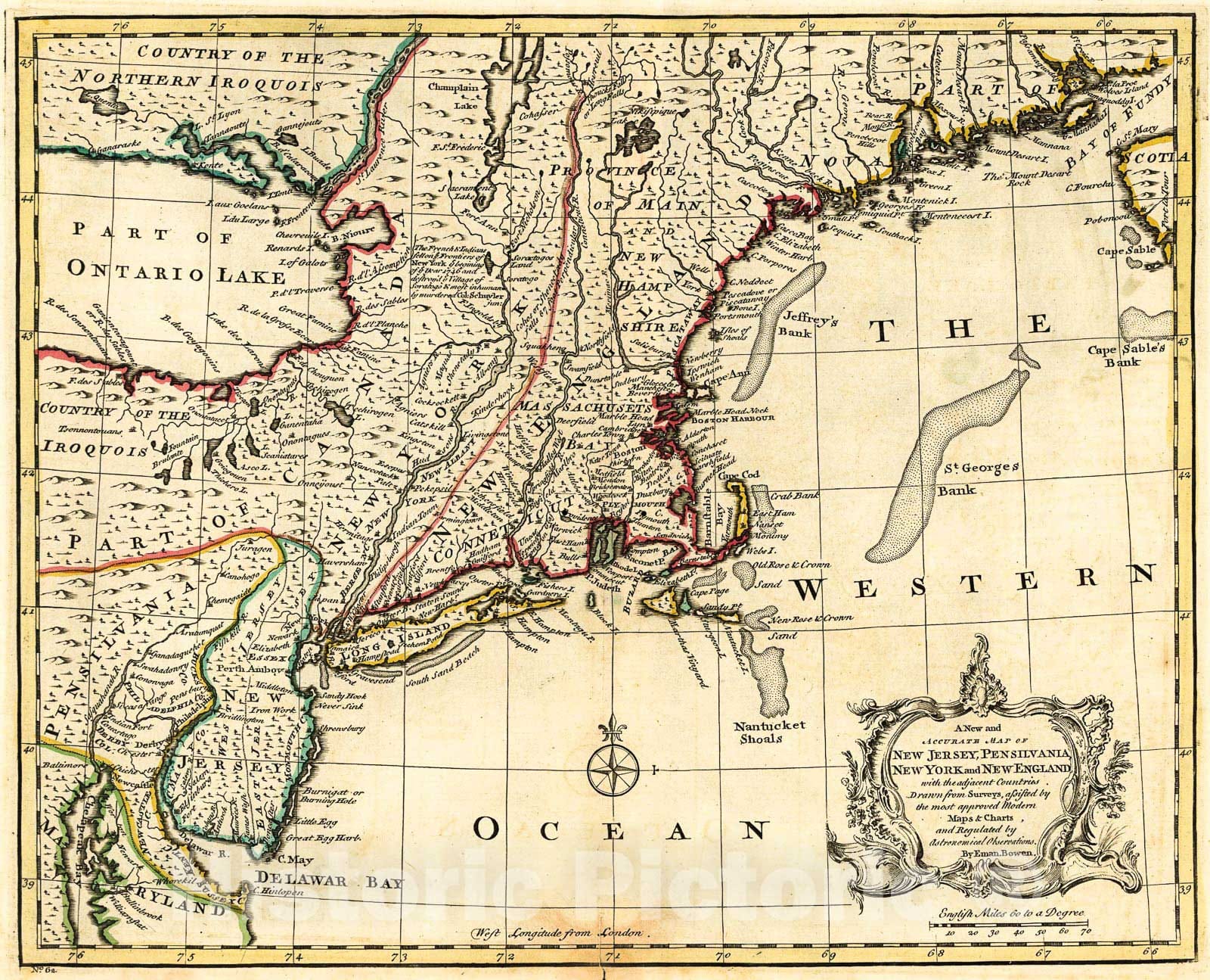 Historic 1752 Map - A New and Accurate map of New Jersey, Pensilvania, New York and New England with The Adjacent Countries.