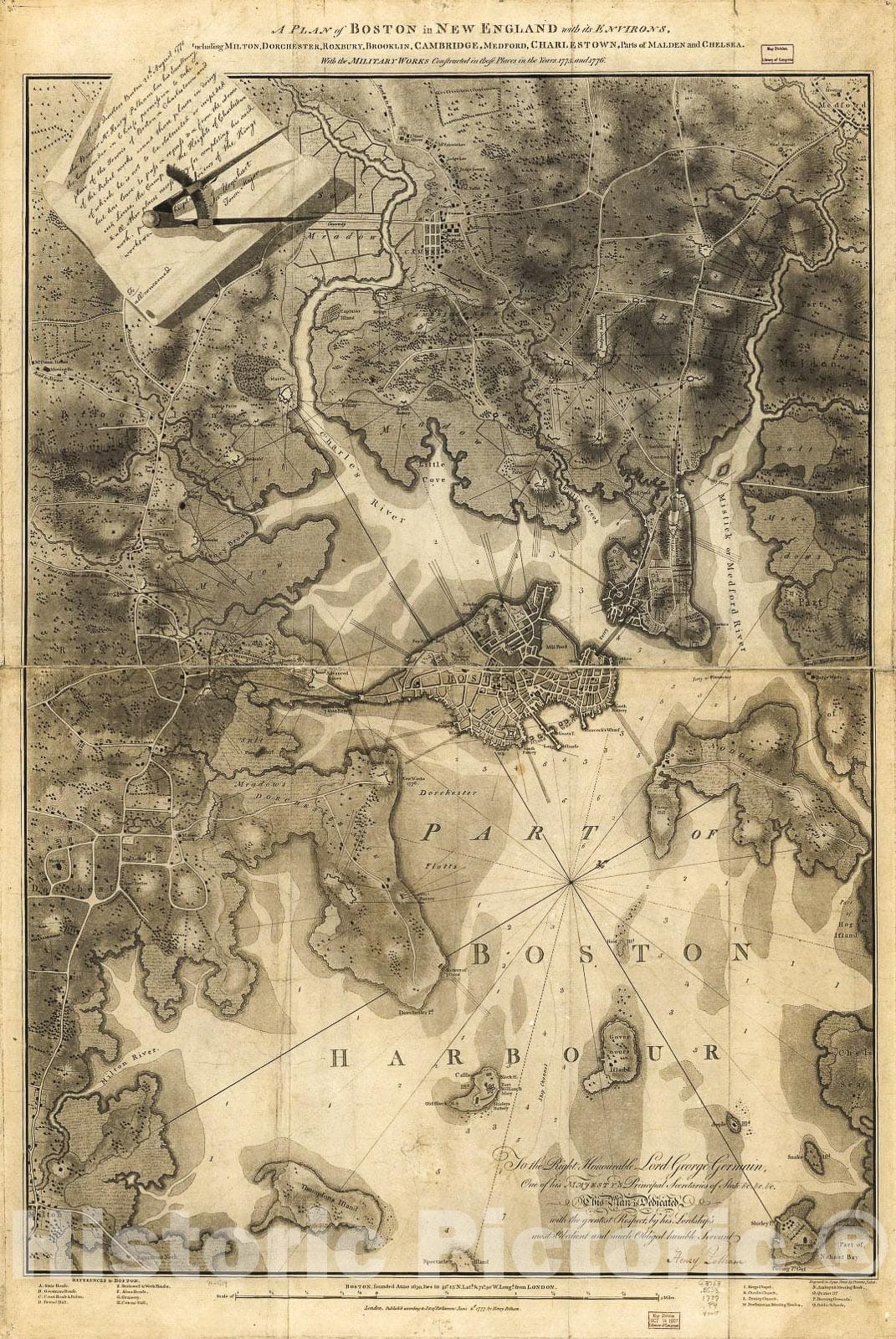Historic 1777 Map - A Plan of Boston in New England with its Environs, Including Milton, Dorchester, Roxbury, Brooklin, Cambridge, Medford, Charlestown, Parts of Malden and Chelsea