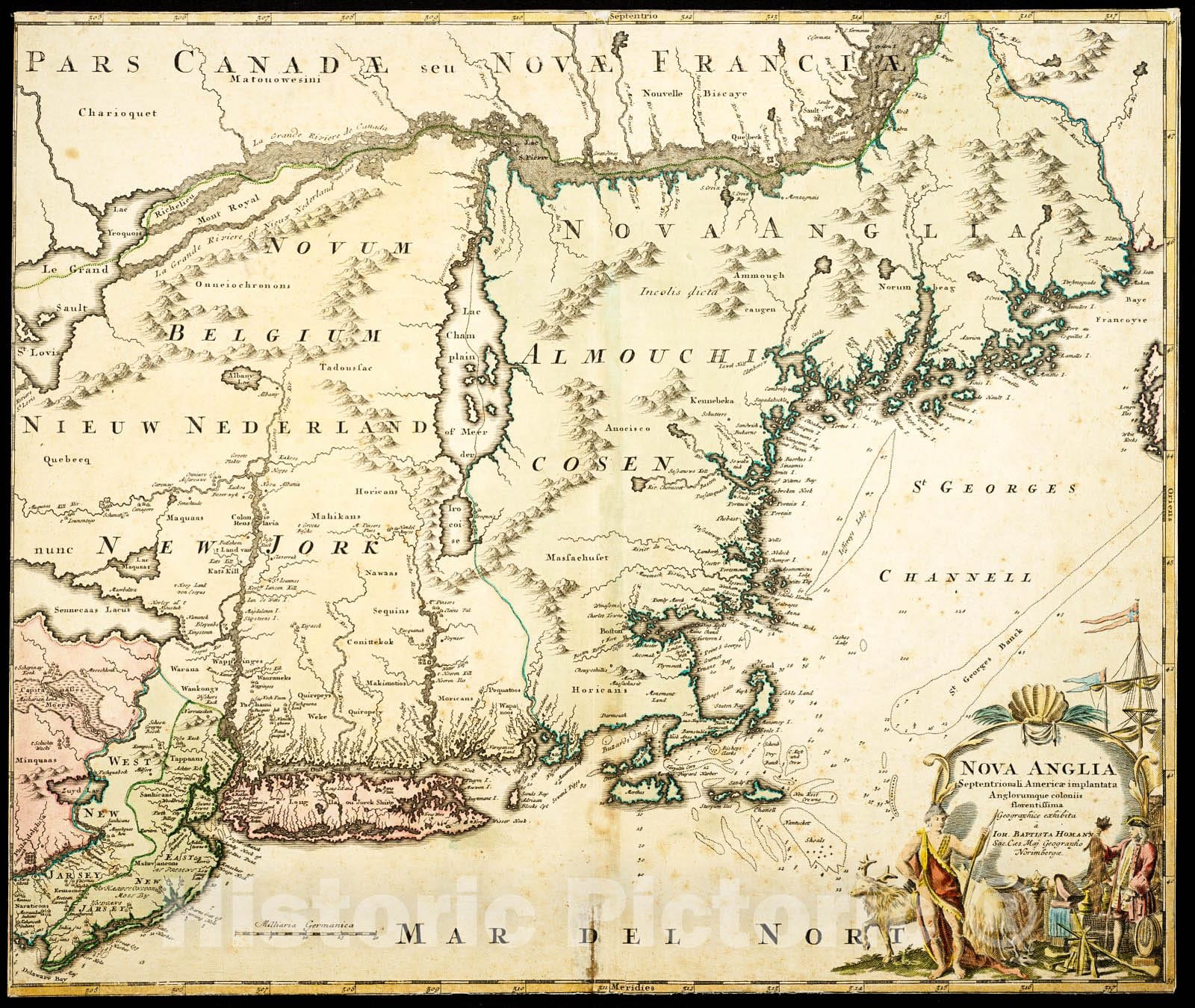 • .Historic Map : 1759 Nova Anglia, Septentrionali America implantata Anglorumque coloniis florentissima Baptista Homann, English colonies of New England, North America : Vintage Wall Art