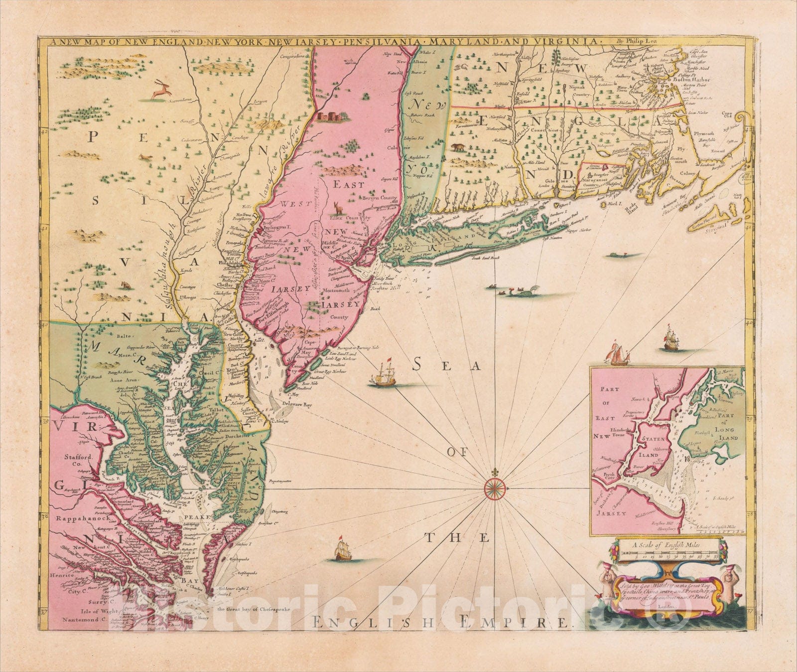 A New Map of New England New York New Iarsey Pensilvania Maryland and Virginia, c1685,