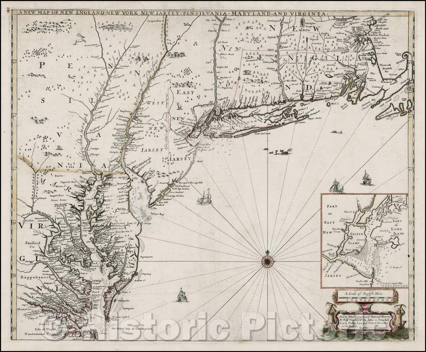 Historic Map - New England New York New Iarsey Pensilvania Maryland and Virginia, 1685, Robert Morden - Vintage Wall Art