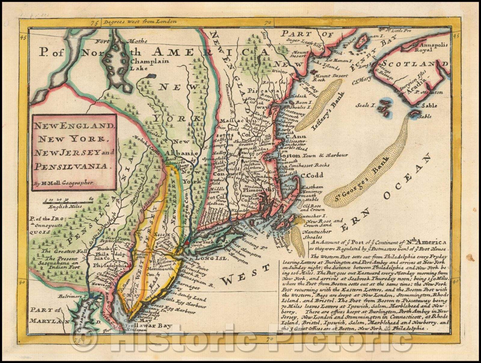 Historic Map - New England, New York, New Jersey and Pensilvania (First map to show American post roads), 1729, Herman Moll v2