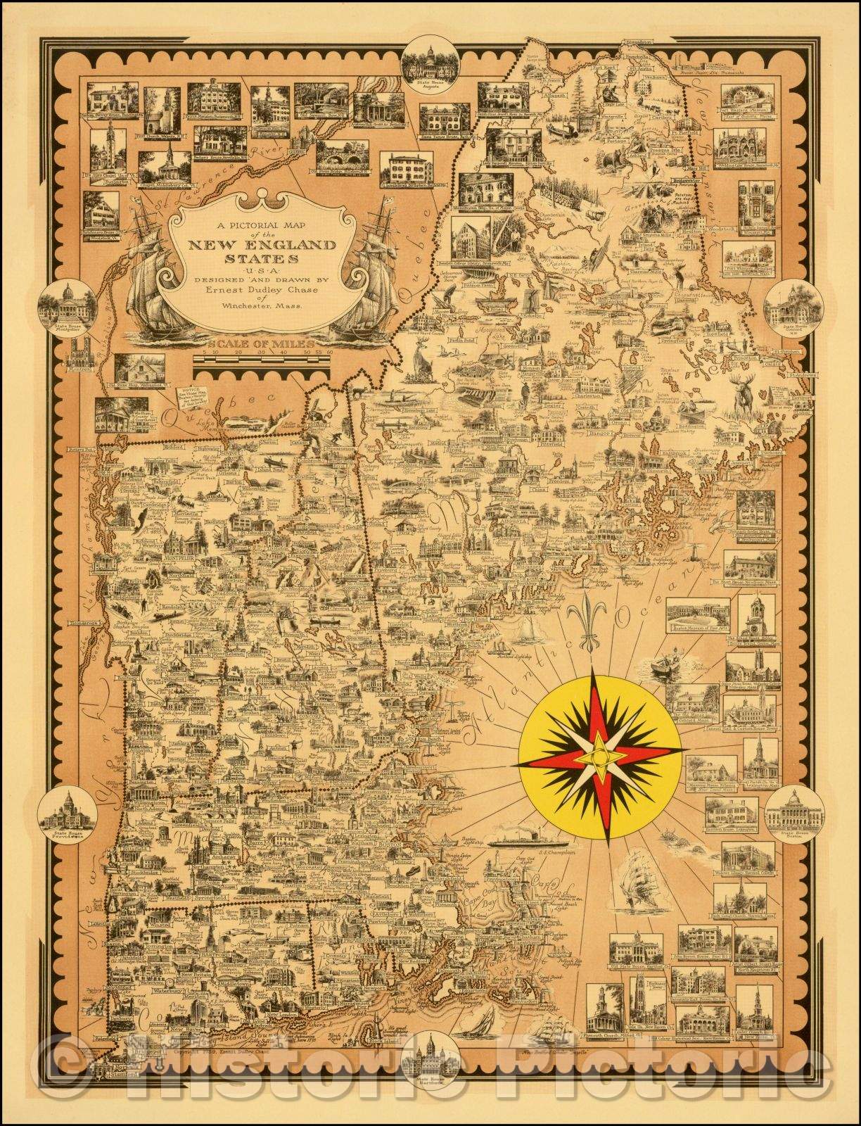 Historic Map - A Pictorial Map of the New England States USA, 1939, Ernest Dudley Chase v2