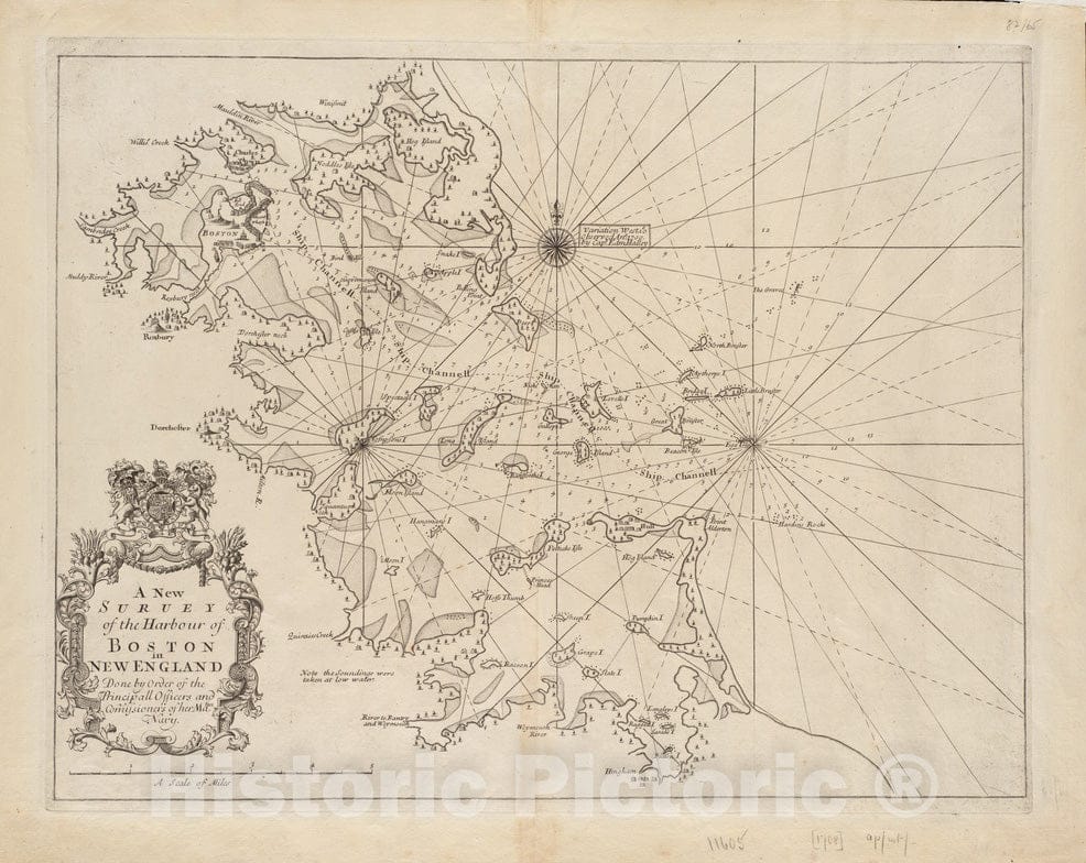Historical Map, 1708 A New Survey of The Harbour of Boston in New England : Done by Order of The principall Officers and comissioners of Her Maties. Navy, Vintage Wall Art