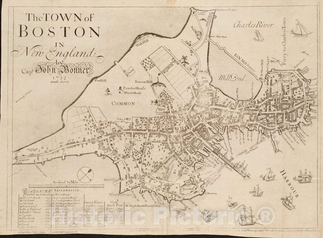 Historical Map, 1723-1733 The Town of Boston in New England, Vintage Wall Art