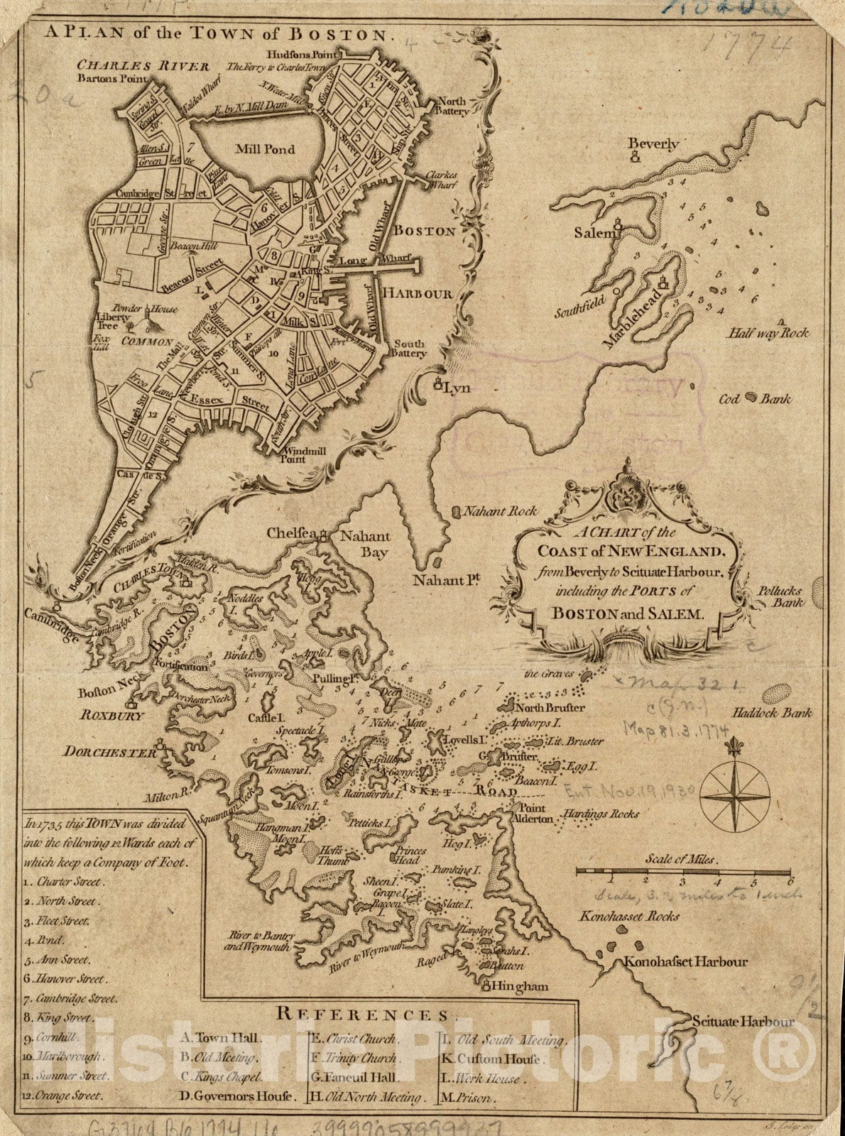 Historical Map, 1774 A Chart of The Coast of New England, from Beverly to Scituate Harbour, Including The Ports of Boston and Salem, Vintage Wall Art