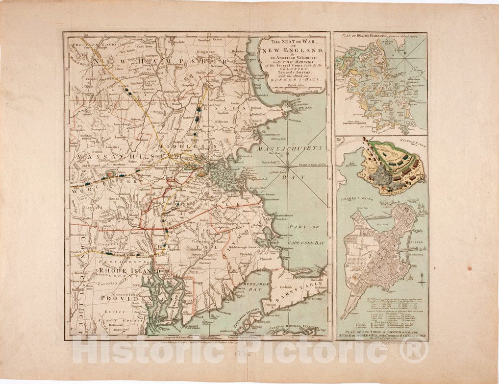 Subject: Map of the eastern half of Massachusetts, Rhode Island and part of New Hampshire showing the lines of troops that marched in from the north, south and west towards Boston during the Battle of Bunkers Hill. Troops and horse drawn carts are seen crossing the land into Boston. Also includes a plan of Boston Harbor and a map of Boston and Charlestown during the Battle.
