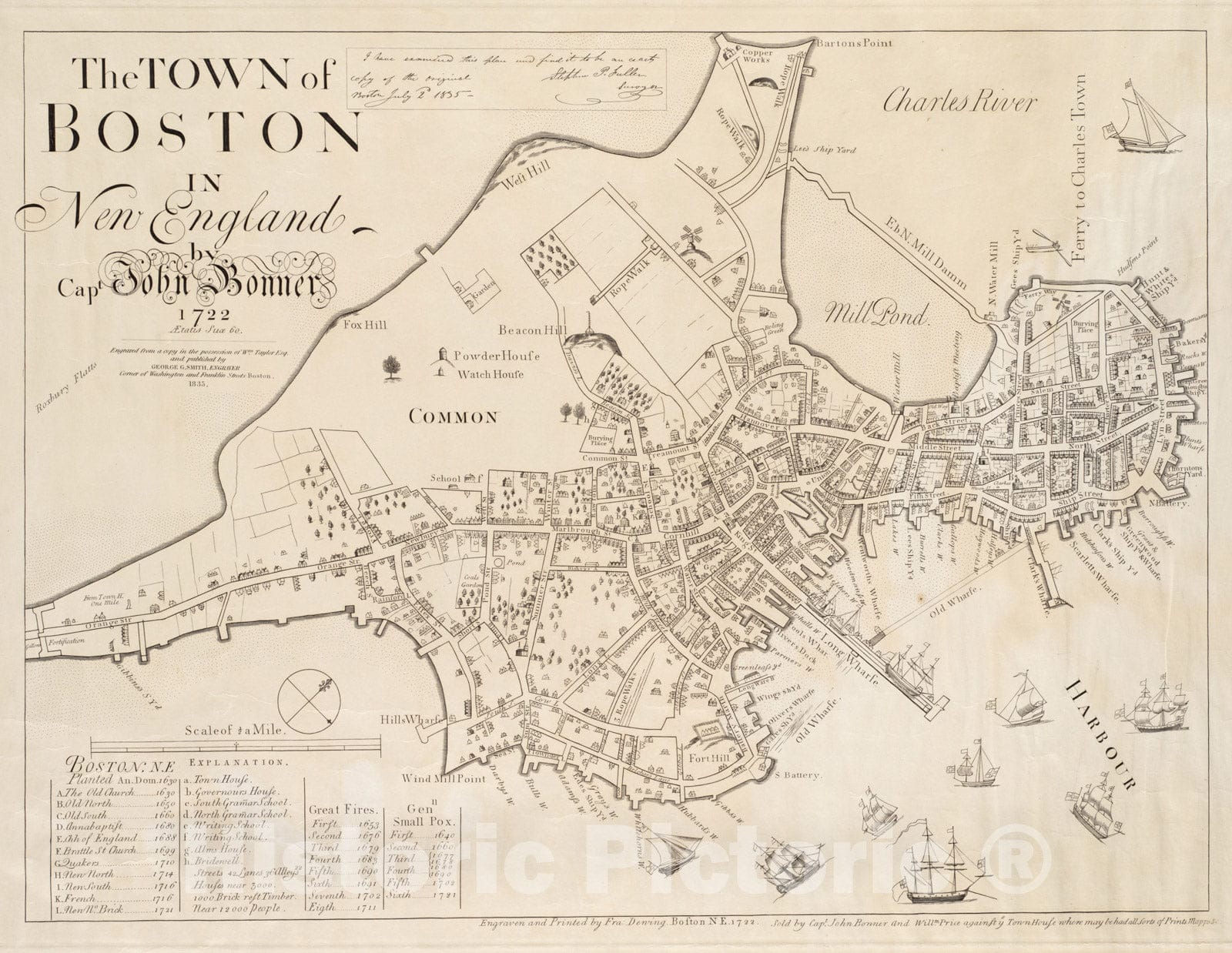 Historical Map, 1835 The Town of Boston in New England, Vintage Wall Art