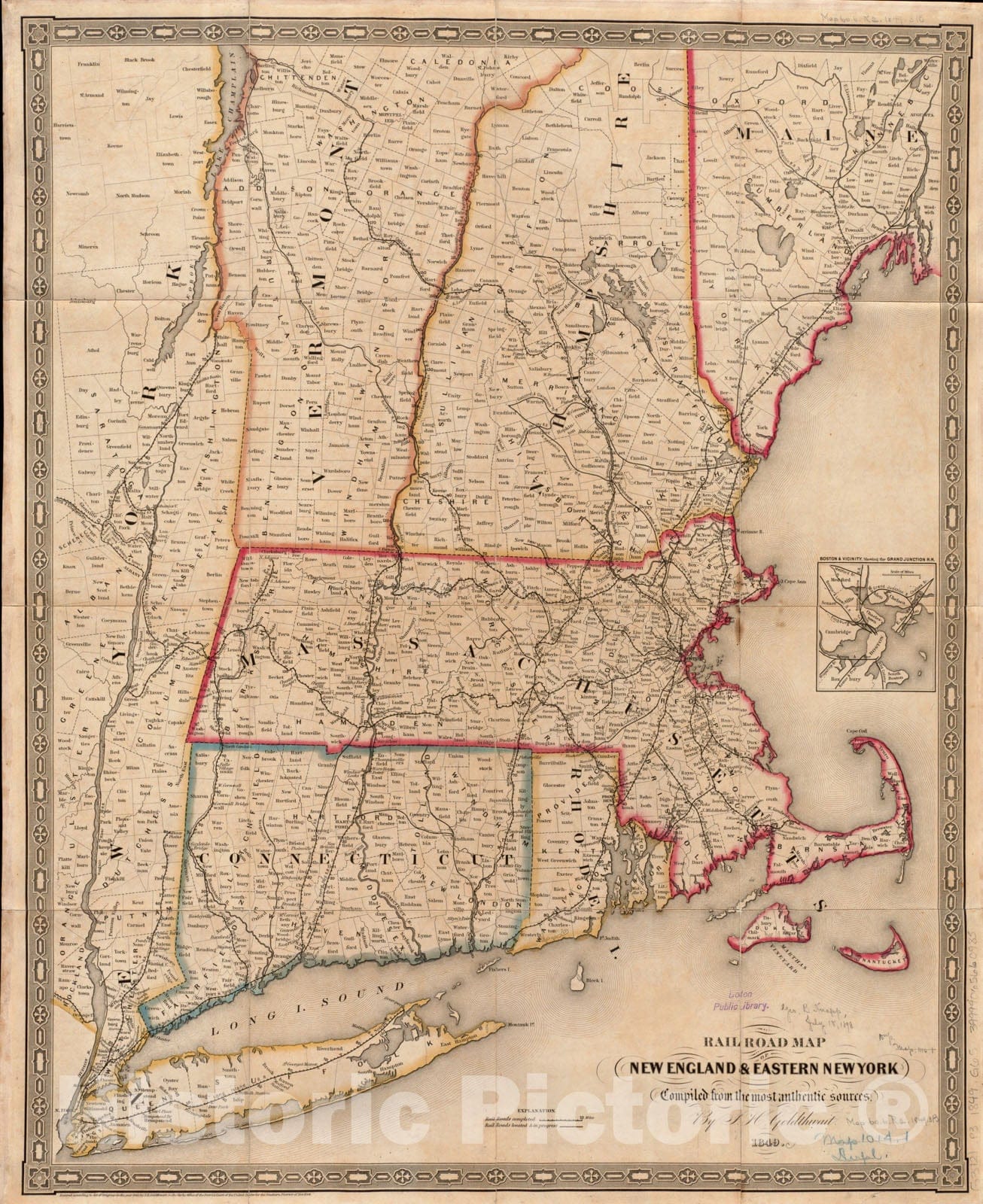 Historical Map, 1849 Rail road map of New England & eastern New York, Vintage Wall Art