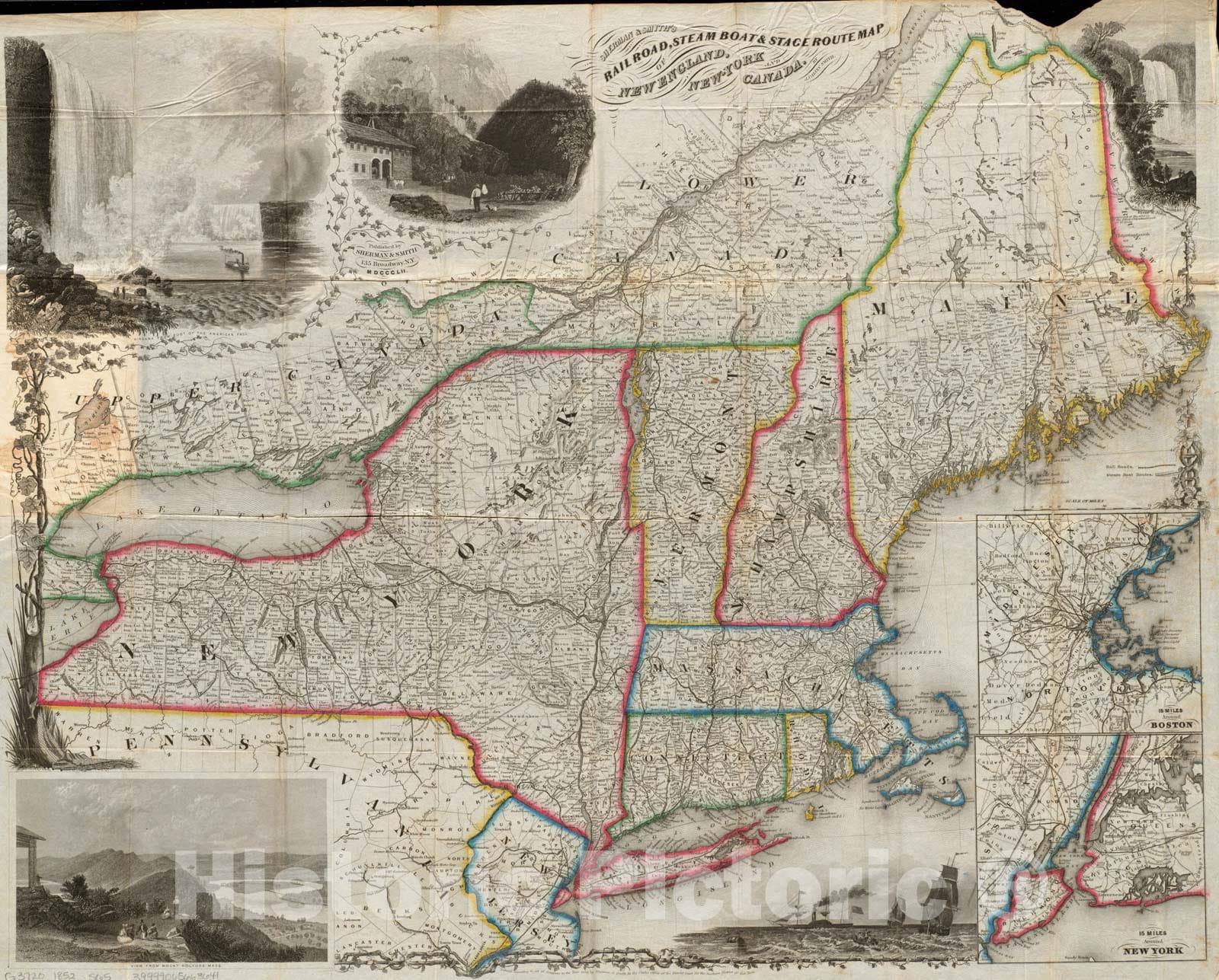 Historical Map, 1852 Sherman & Smith's Rail Road, steam Boat & Stage Route map of New England, New-York, and Canada, Vintage Wall Art