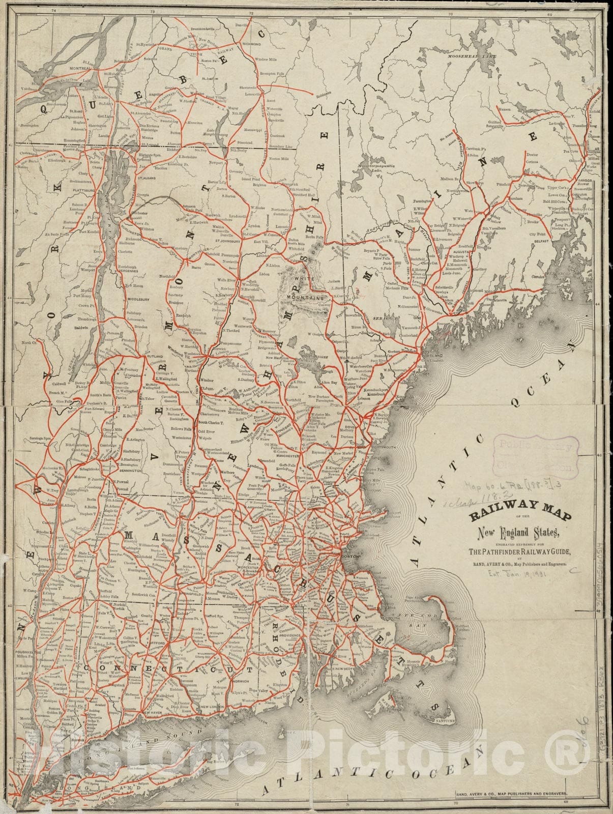 • .Historical Map, 1870-1879 Railway map of The New England States, Engraved expressly for The Pathfinder Railway Guide, Vintage Wall Art