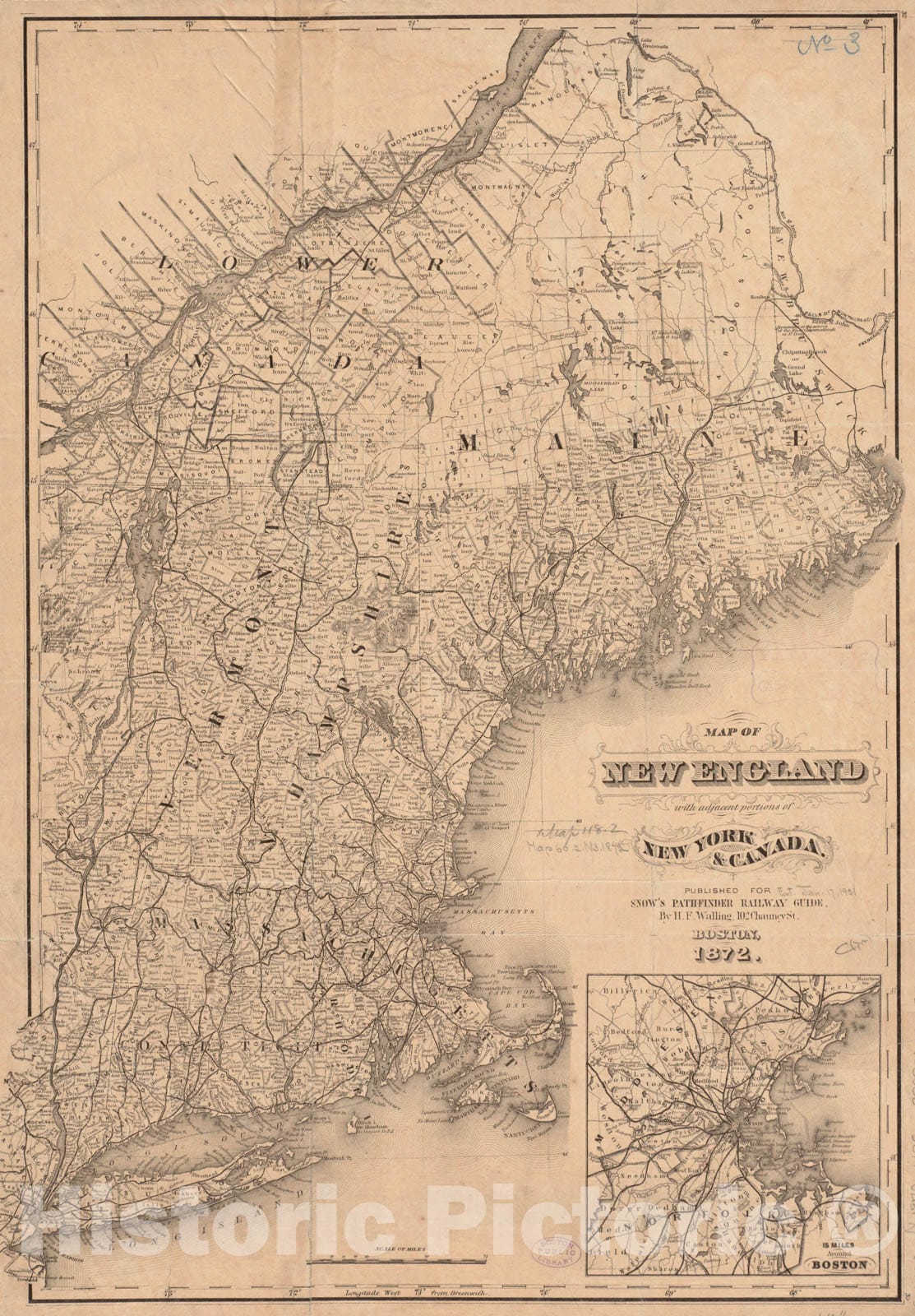 • .Historical Map, 1872 Map of New England with Adjacent portions of New York & Canada, Vintage Wall Art