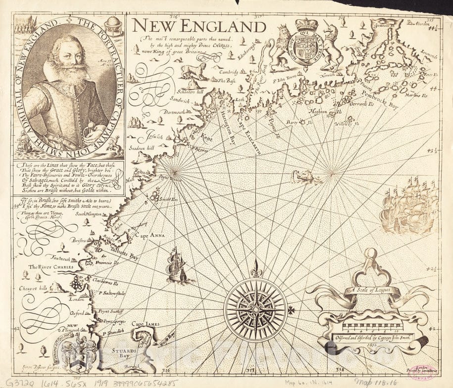 • Historical Map, 1919 New England : The Most remarqueable Parts Thus Named by The high and Mighty Prince Charles, nowe King of Great Britaine, Vintage Wall Art