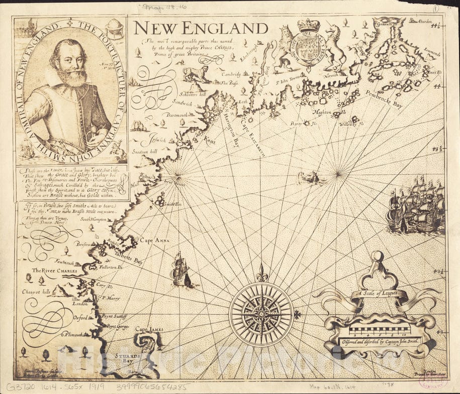 Historical Map, 1919 New England : The Most remarqueable Parts Thus Named by The high and Mighty Prince Charles, Prince of Great Britaine, Vintage Wall Art
