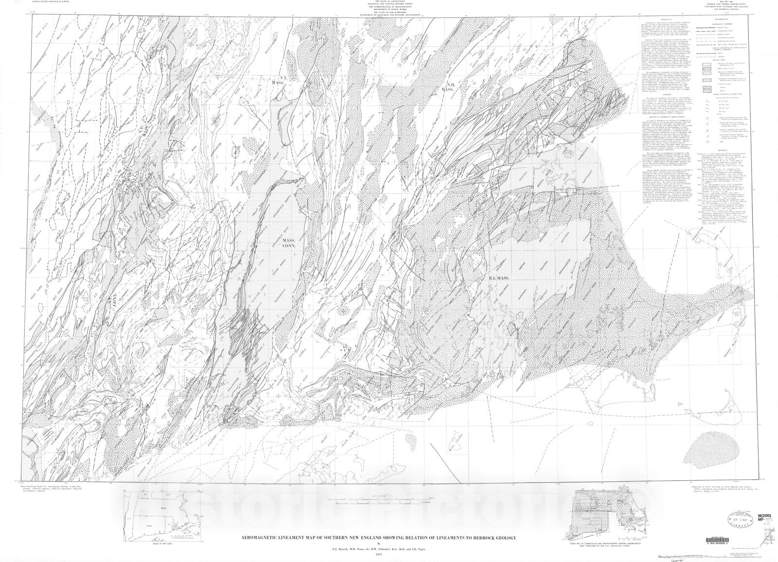 Map : Aeromagnetic lineament map of southern New England showing relation of lineaments to bedrock geology, 1977 Cartography Wall Art :