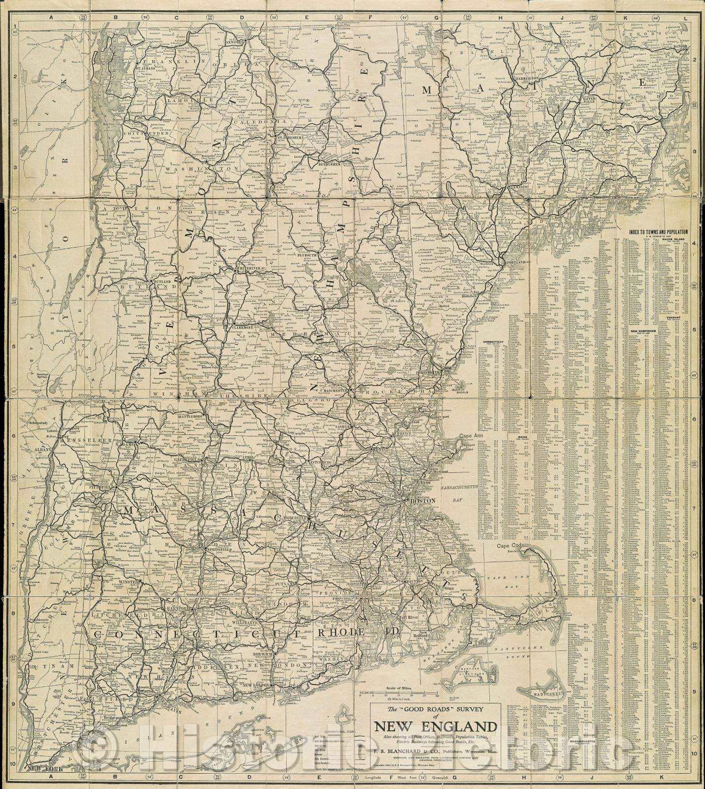 Historic Map : The Good Roads Survey of New England Also showing all Post Offices, Railroads, Population Tables, Electric Railways following Good Roads, Etc., 1905 , Vintage Wall Art