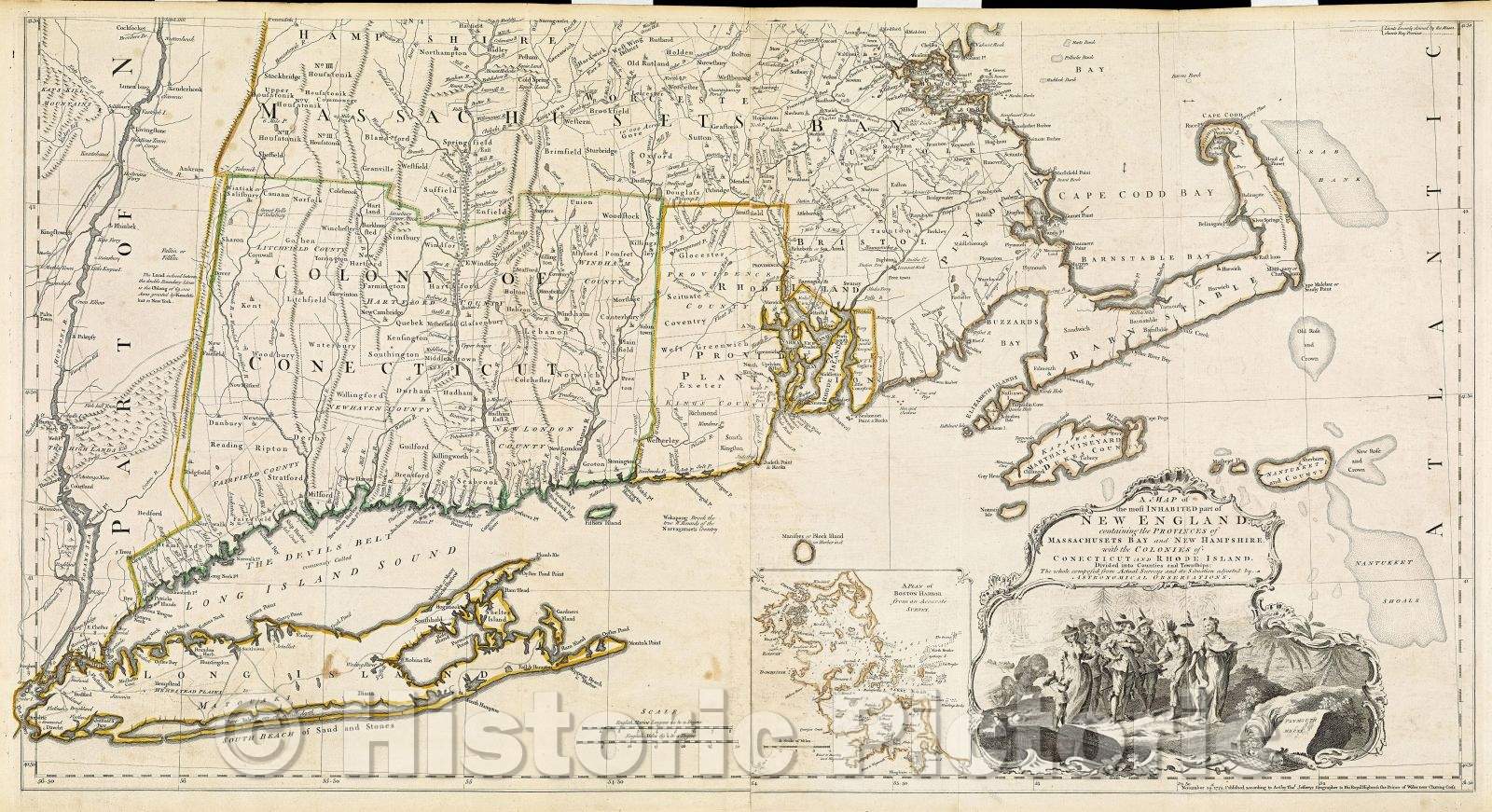 • .Historic Map : A Map of the most Inhabited part of New England, containing the Provinces of Massachusetts Bay and New Hampshire. with the Colonies of Conecticut, c. 1765 , Vintage Wall Art , v2