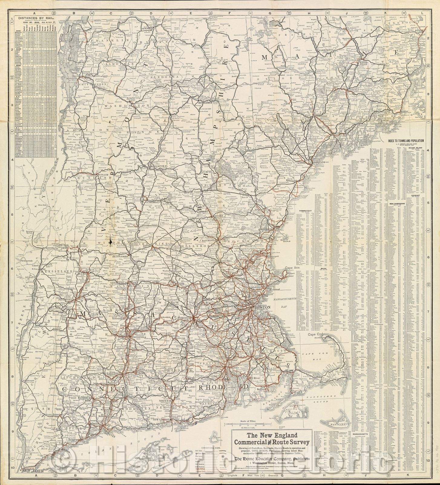 • .Historic Map : The New England Commercial and Route Survey Showing all Postoffices, Railroads, Electric Roads in operation and proposed, Good Roads, Population, 1905 , Vintage Wall Art , v2