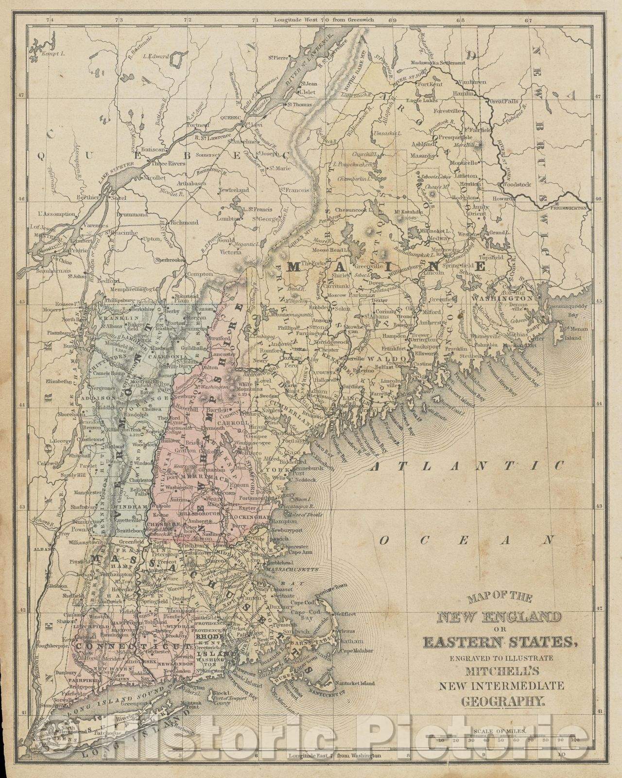 • .Historic Map : Map of the New England or Eastern states engraved to illustrate Mitchell's new intermediate geography., 1895 , Vintage Wall Art