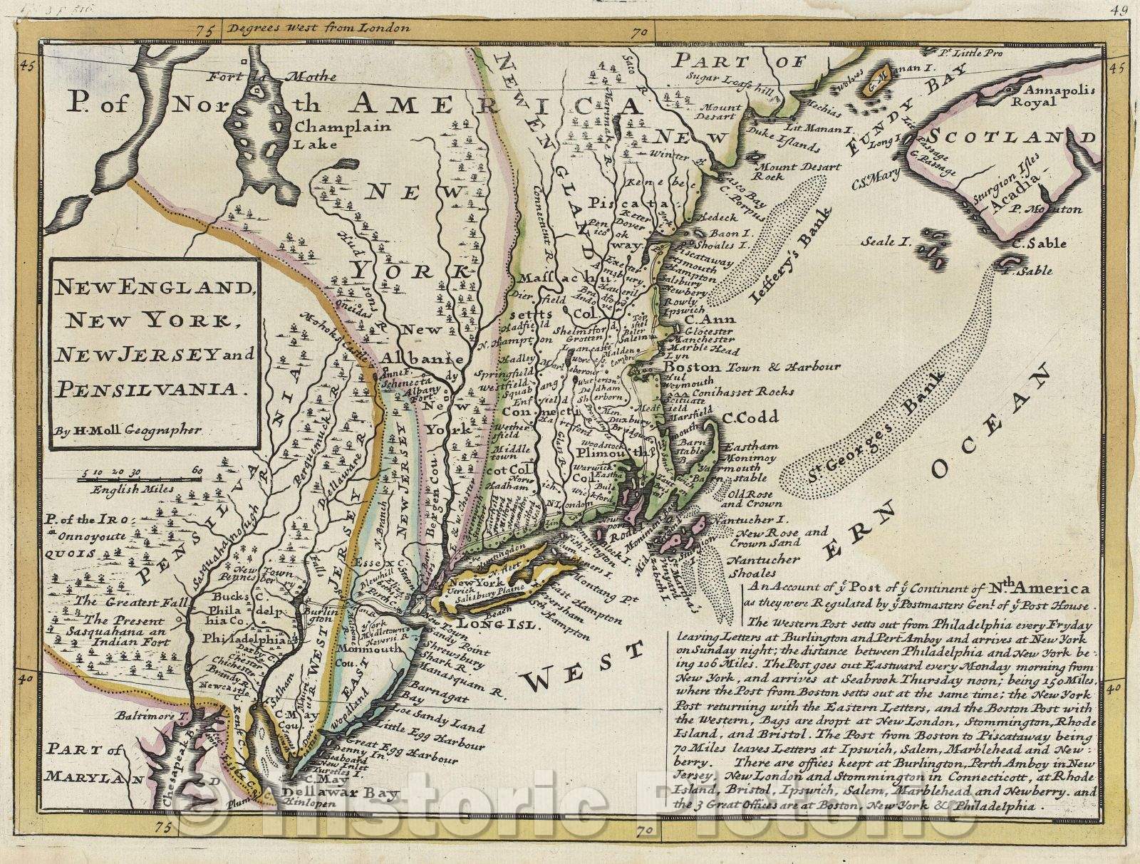 • .Historic Map : New England, New York, New Jersey and Pensilvania by H. Moll, Geographer, 1729 , Vintage Wall Art