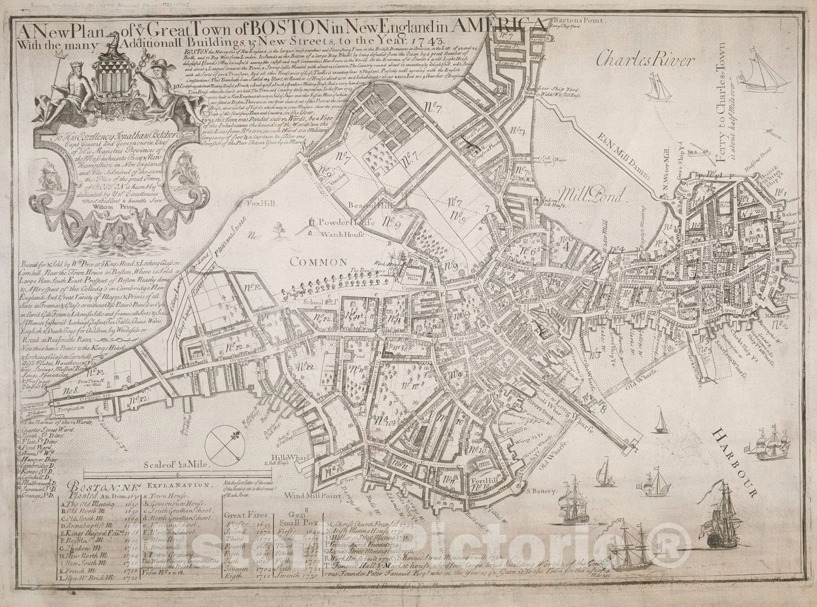 Historical Map, A New Plan of ye Great Town of Boston in New England in America with The Many additionall Buildings & New Streets to The Year 1743, Vintage Wall Art