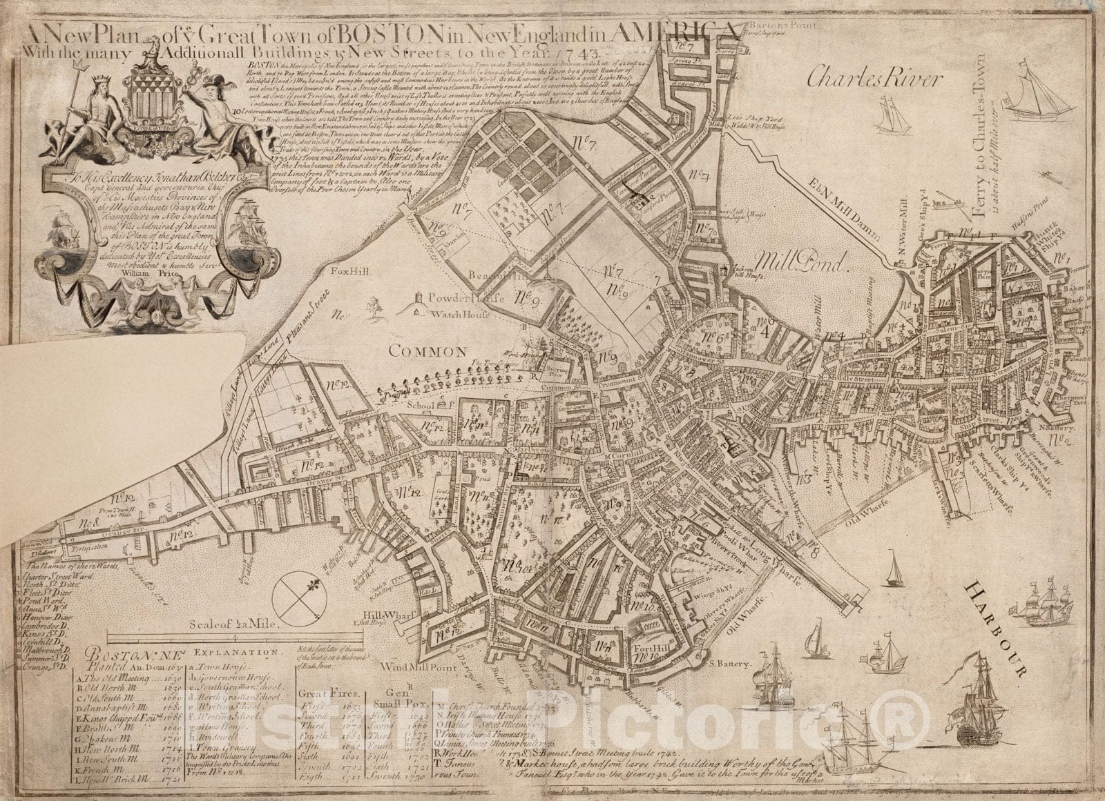 Historical Map, A New Plan of ye Great Town of Boston in New England in America, with The Many additionall Buildings & New Streets to The Year 1743, Vintage Wall Art