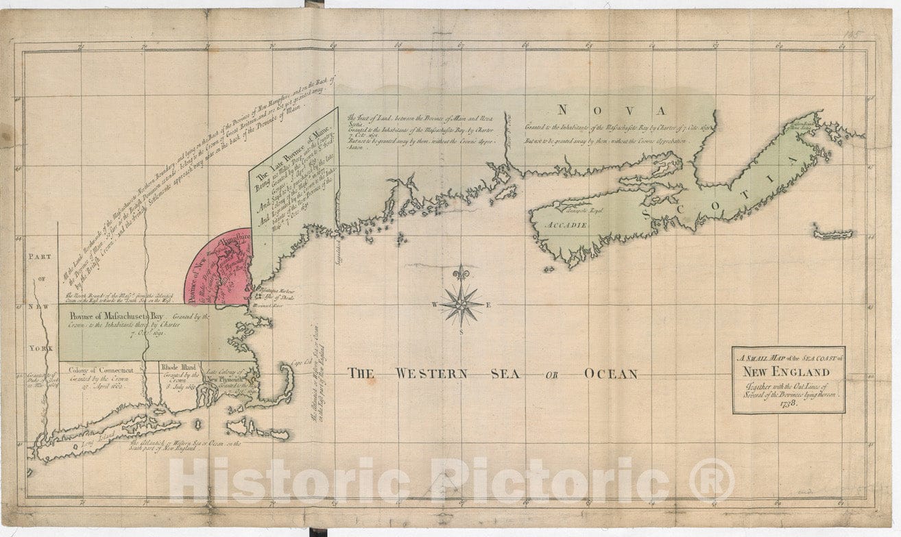 Historical Map, A Small MAP of The SEA Coast of New England Together with The Out Lines of Several of The Provinces Lying Theron. 1738, Vintage Wall Art