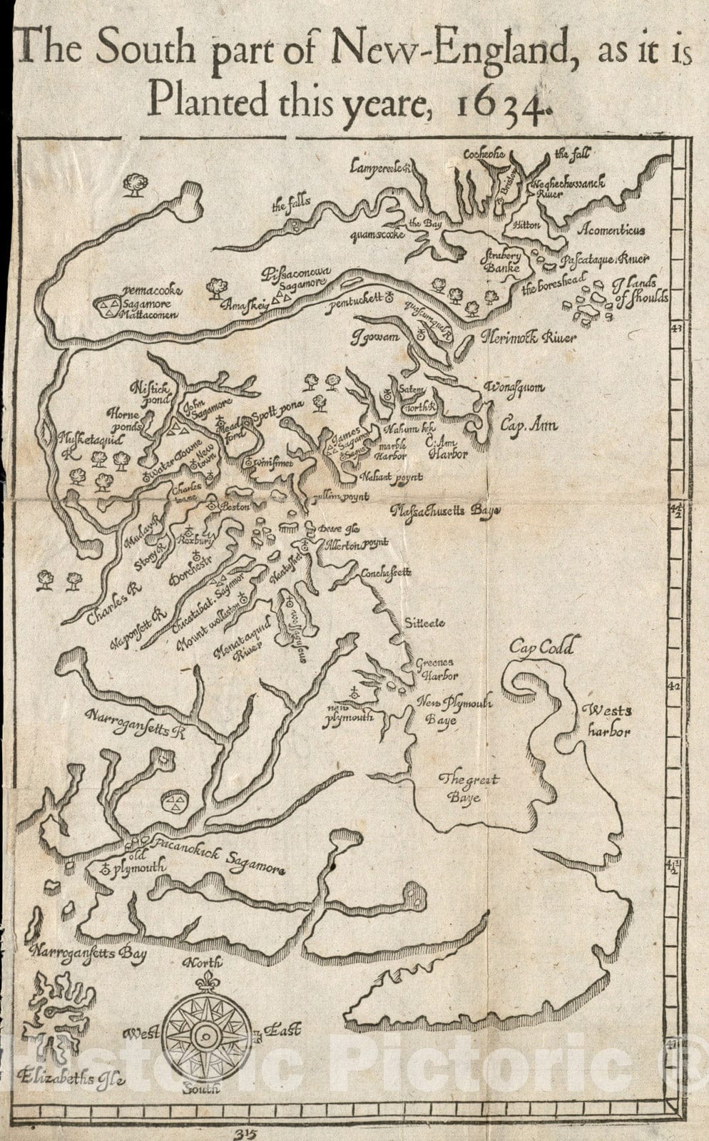 Historical Map, The South Part of New England as it Planted This yeare, 1634, Vintage Wall Art