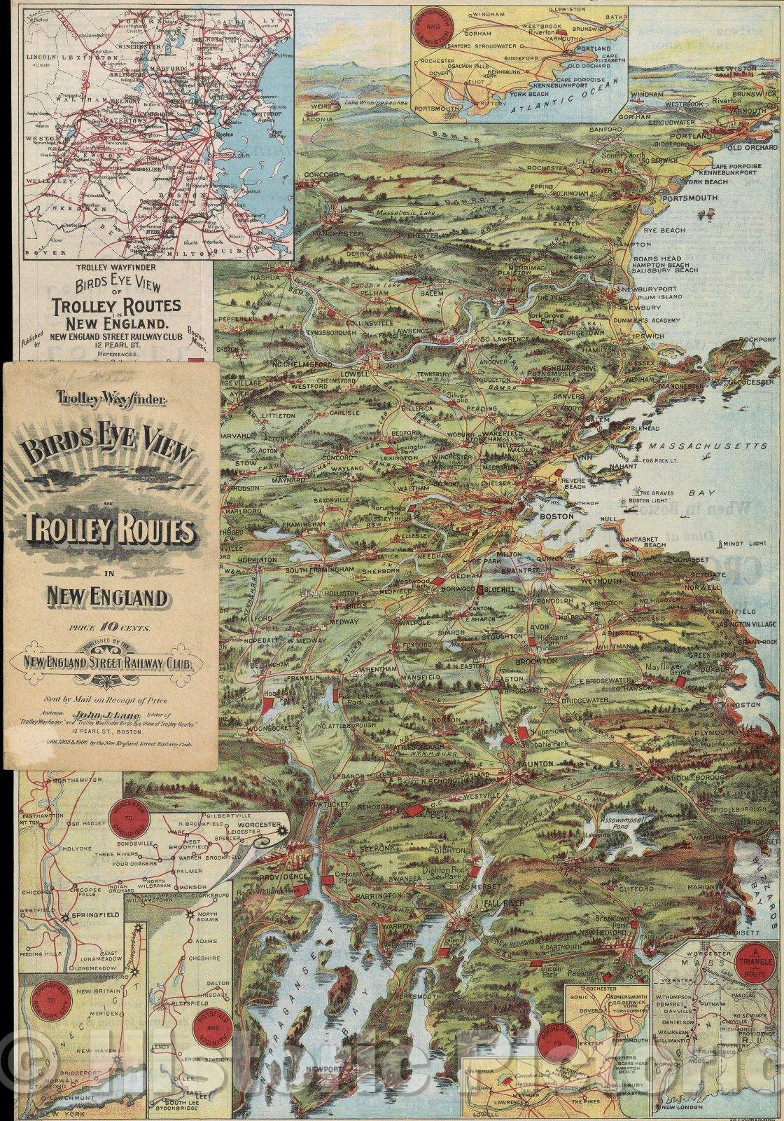 Historic Map : Trolley Wayfinder Birds Eye View of Trolley Routes in New England. Published by New England Street Railway Club. Boston, Mass 12 Pearl St., c. 1905 , Vintage Wall Art