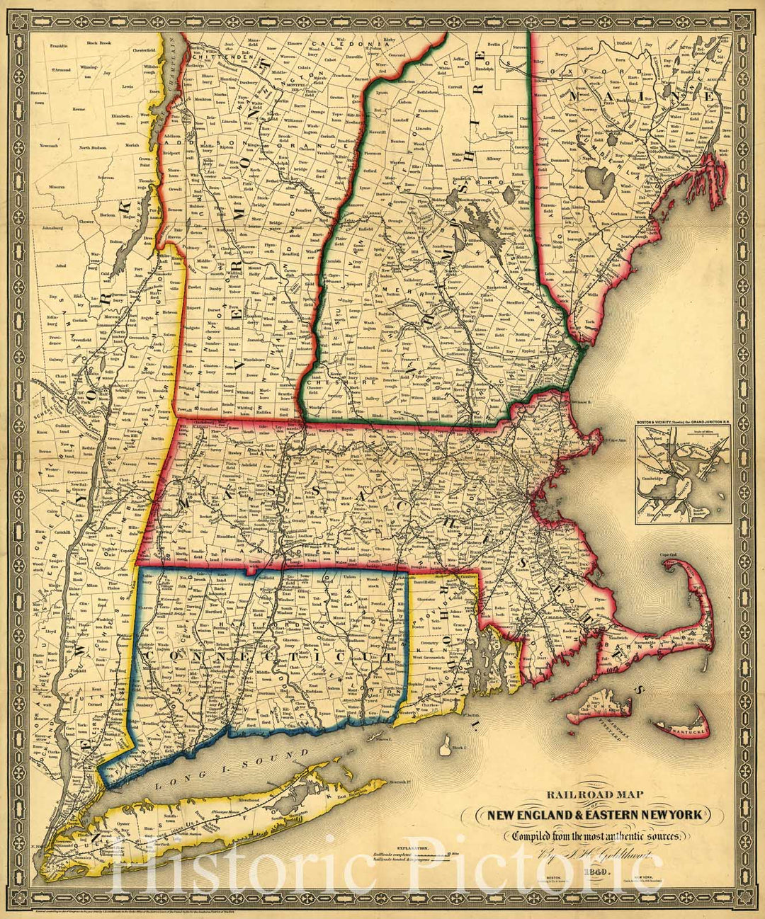 Historic 1849 Map - Railroad map of New England & Eastern New York complied from The Most Authentic Sources.