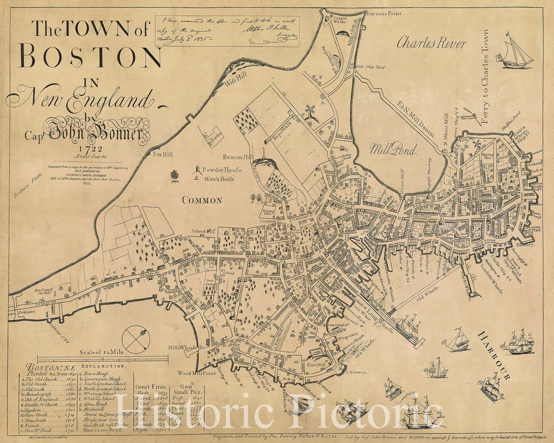 Historic Map : The Town of Boston in New England by Capt John Bonner 1722, 1867 , Vintage Wall Art