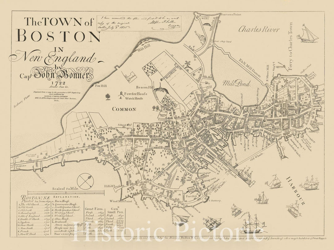 Historic Map : Town of Boston in New England by Capt. John Bonner 1722 , Vintage Wall Art