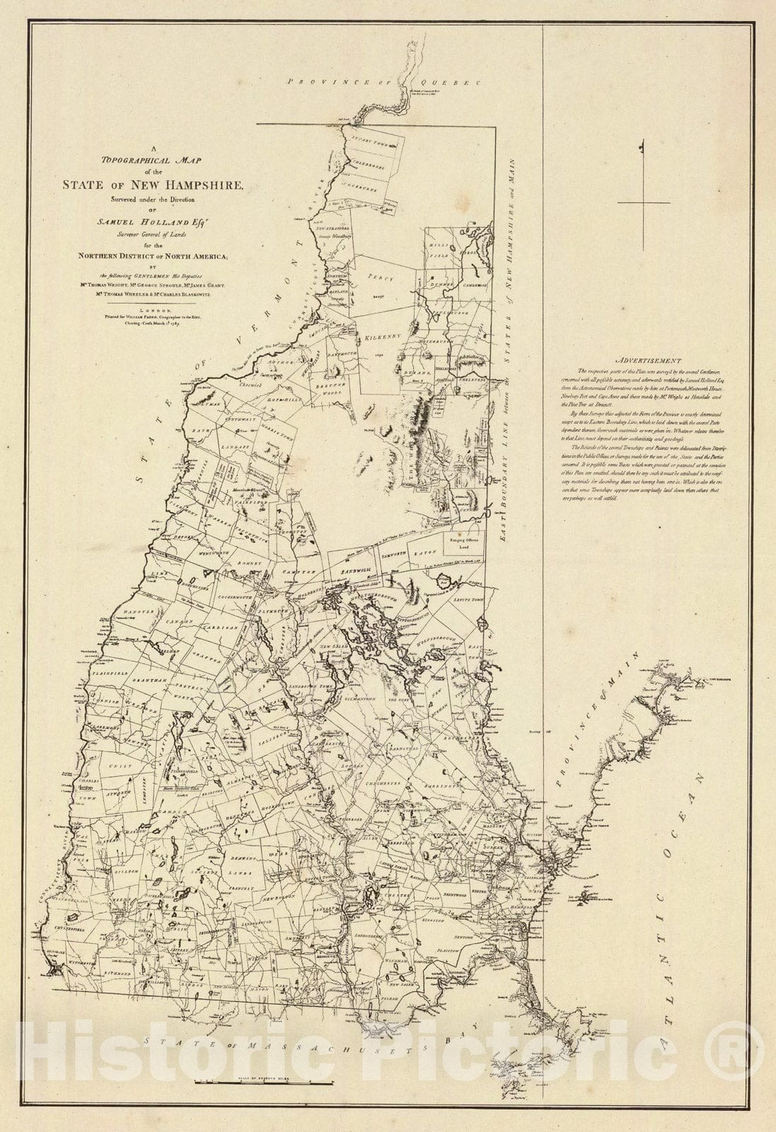 Historic Map : A topographical map of the State of New Hampshire. 1784, 1878, Vintage Wall Art