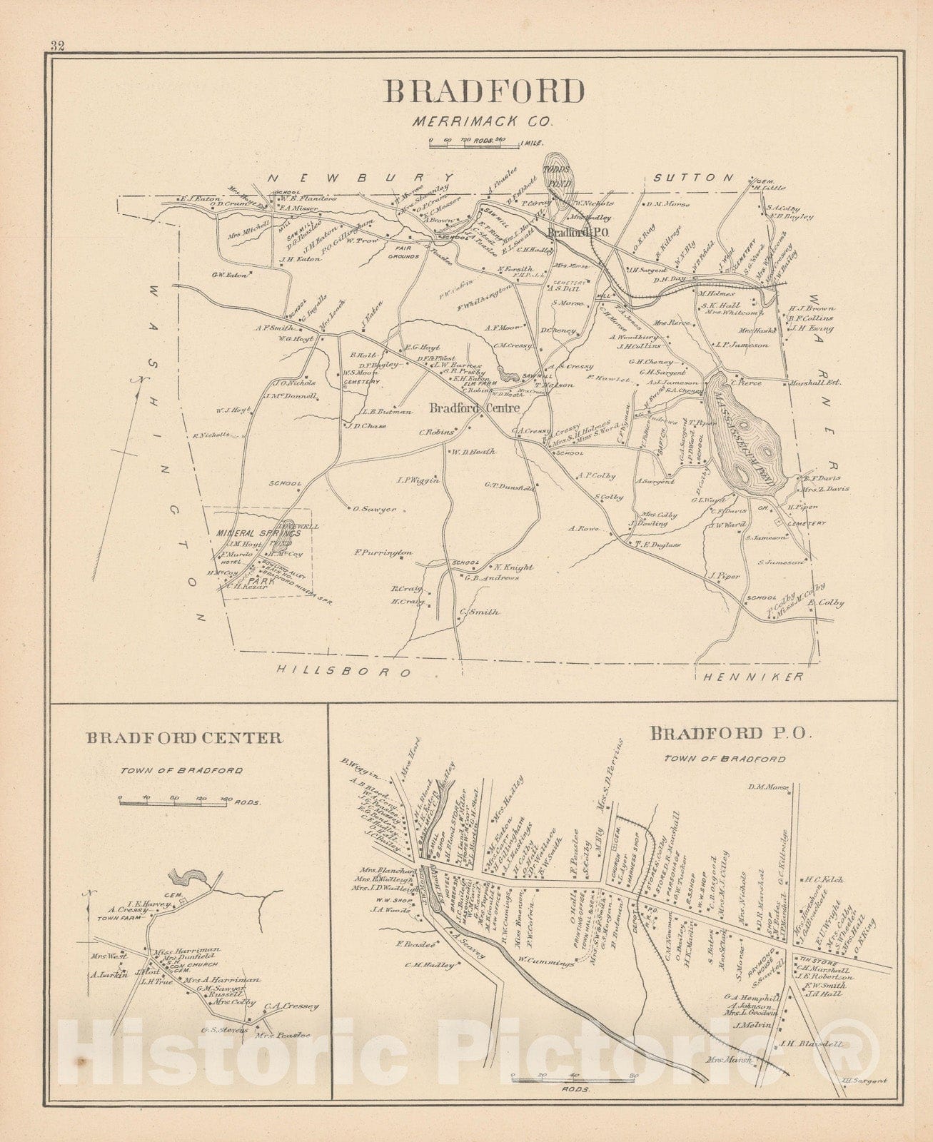 Historic Map : Bradford 1892 , Town and City Atlas State of New Hampshire , Vintage Wall Art