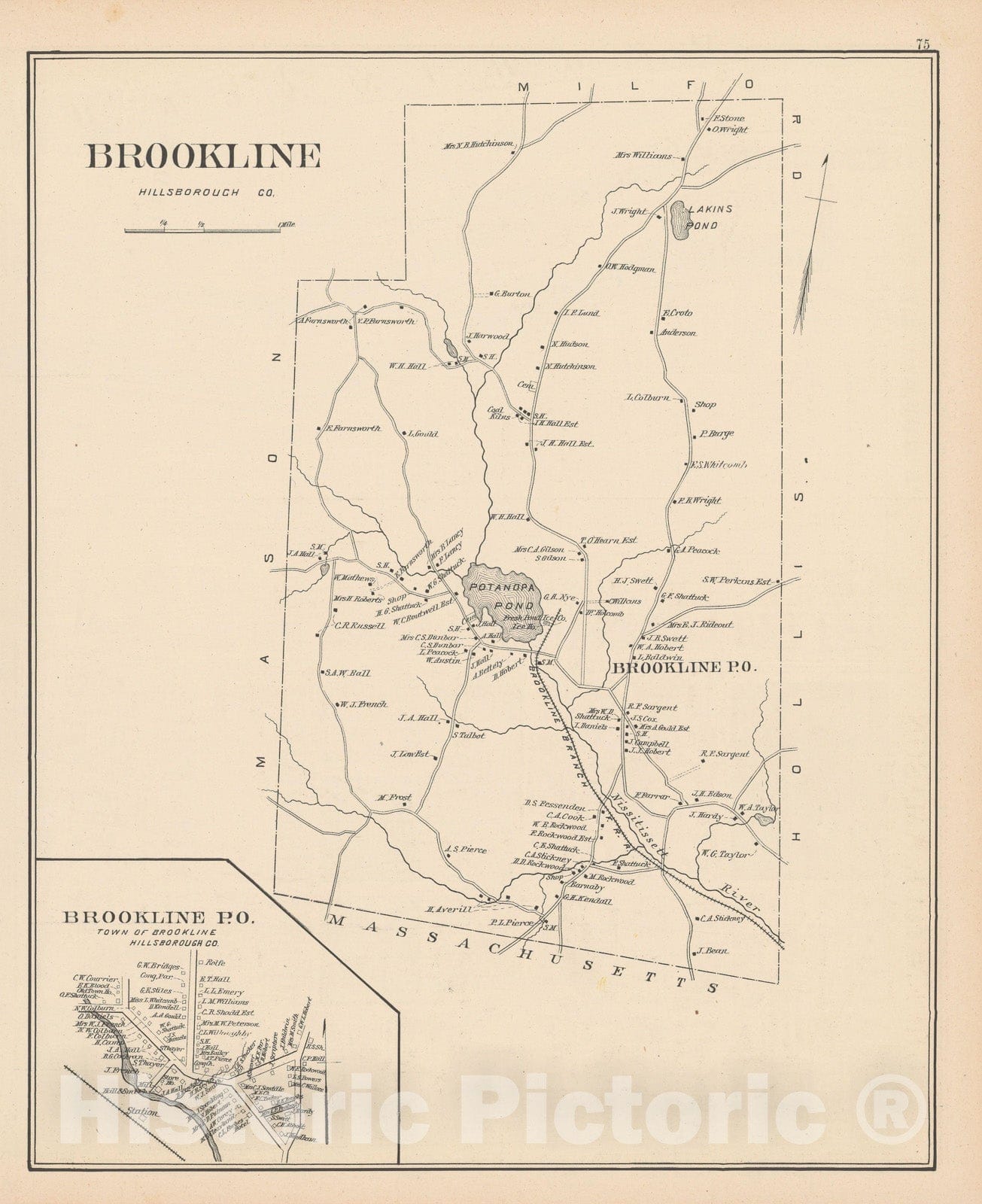 Historic Map : Brookline 1892 , Town and City Atlas State of New Hampshire , Vintage Wall Art