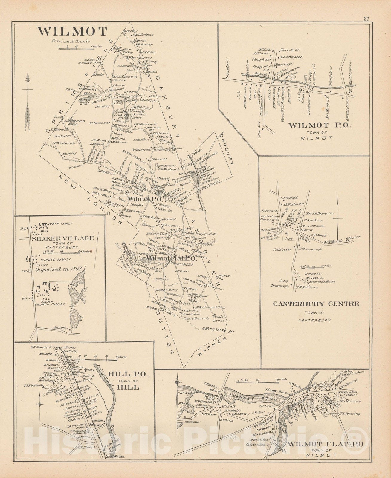 Historic Map : Canterbury & Hill & Wilmot 1892 , Town and City Atlas State of New Hampshire , Vintage Wall Art