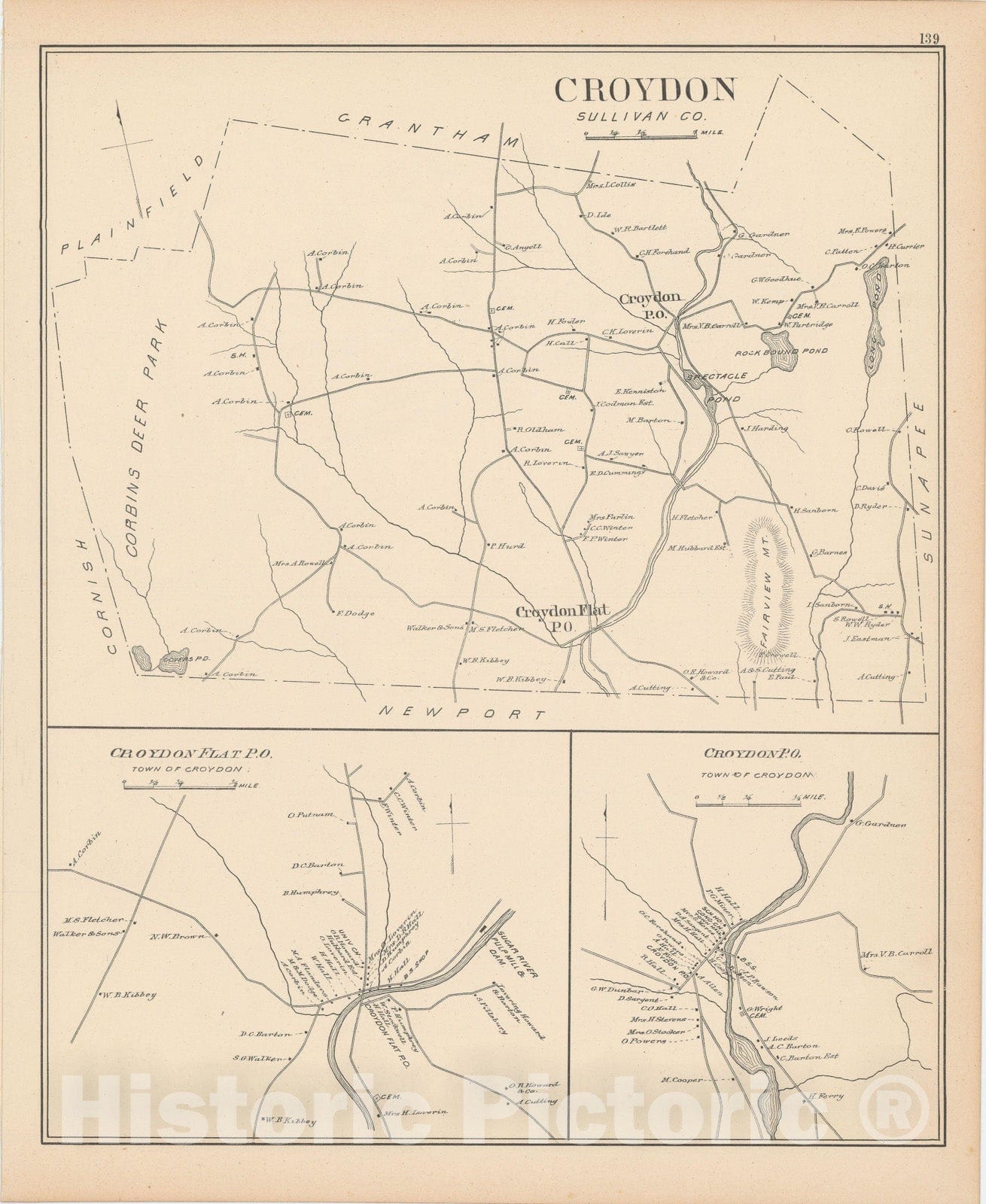 • .Historic Map : Croydon 1892 , Town and City Atlas State of New Hampshire , Vintage Wall Art