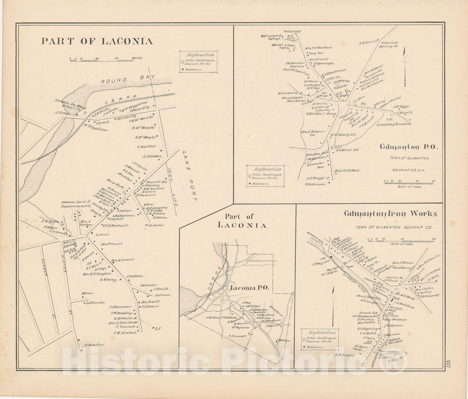 • .Historic Map : Gilmanton & Laconia 1892 , Town and City Atlas State of New Hampshire , Vintage Wall Art