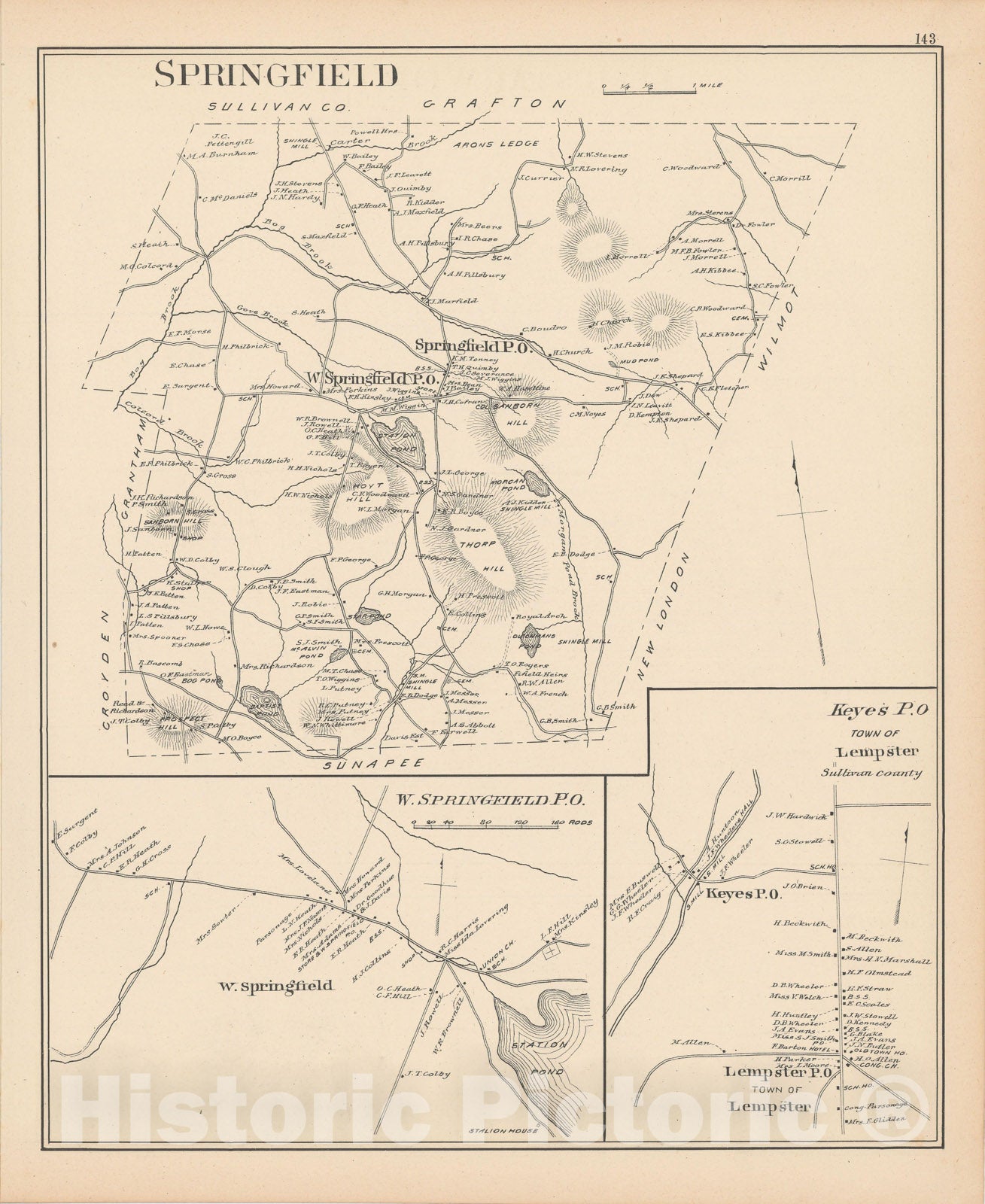 • .Historic Map : Lempster & Springfield 1892 , Town and City Atlas State of New Hampshire , Vintage Wall Art