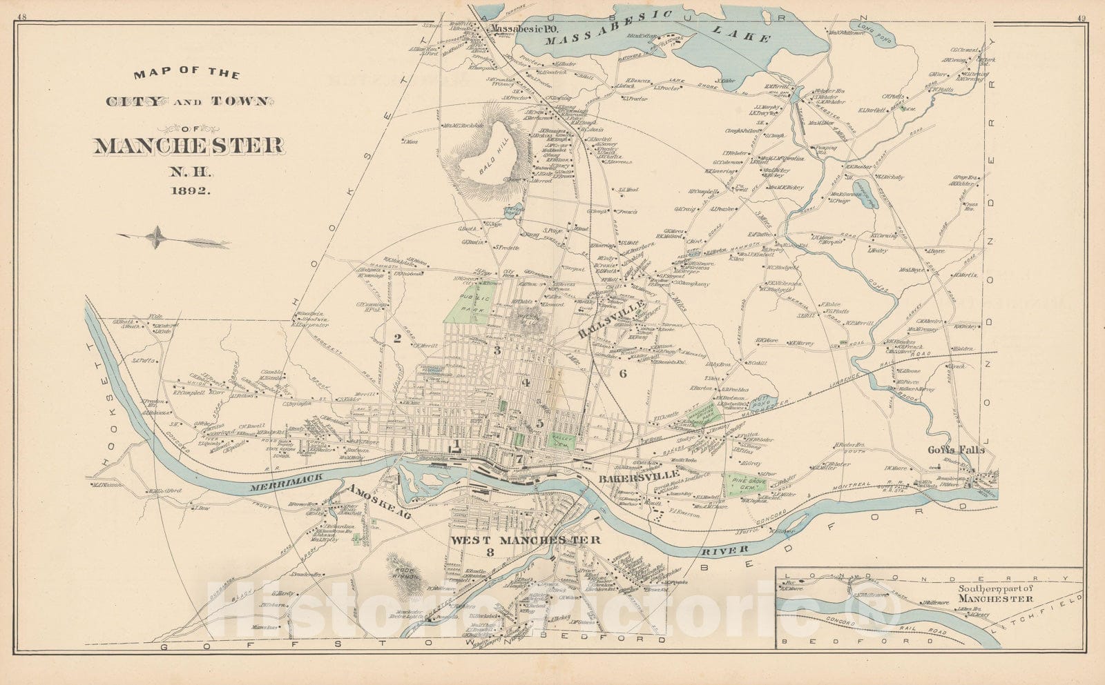 Historic Map : Manchester 1892 , Town and City Atlas State of New Hampshire , v13, Vintage Wall Art