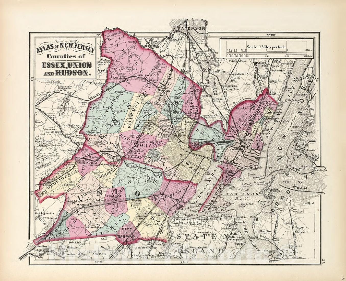 • .Historic 1873 Map - Combined Atlas of The State of New Jersey - Counties od Essex, Union and Hudson - Atlas of The Late Township of Greenville