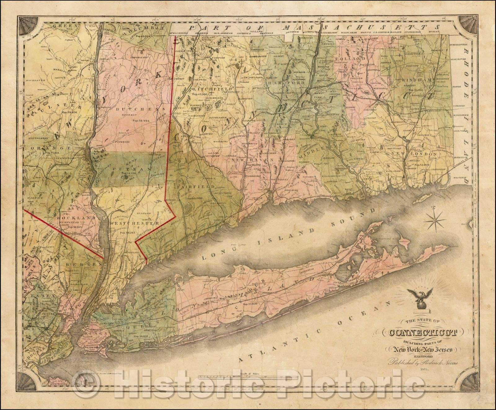 Historic Map - The State of Connecticut Including Parts of New York and New Jersey, 1851, Roderick Nevers - Vintage Wall Art