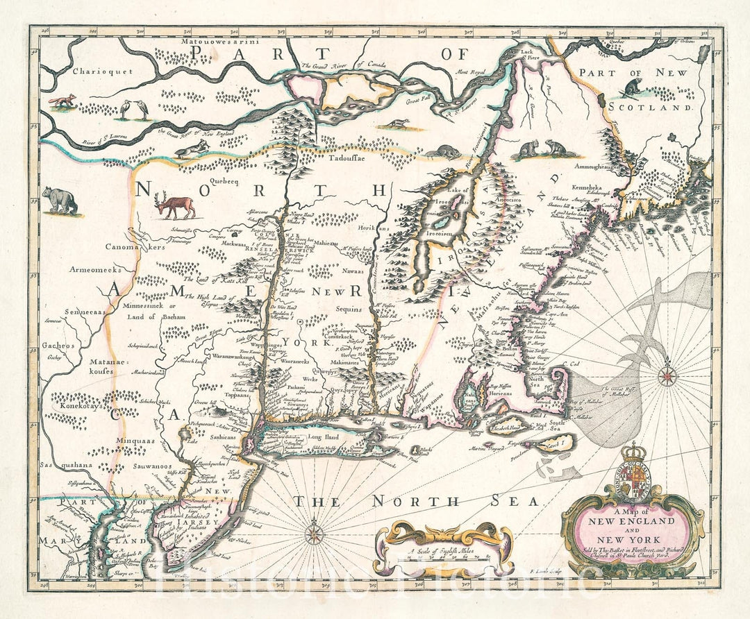 Historic 1676 Map - A Map Of New England And New York - New England - New Jersey - New York (State) Maps Of North America. - Vintage Wall Art