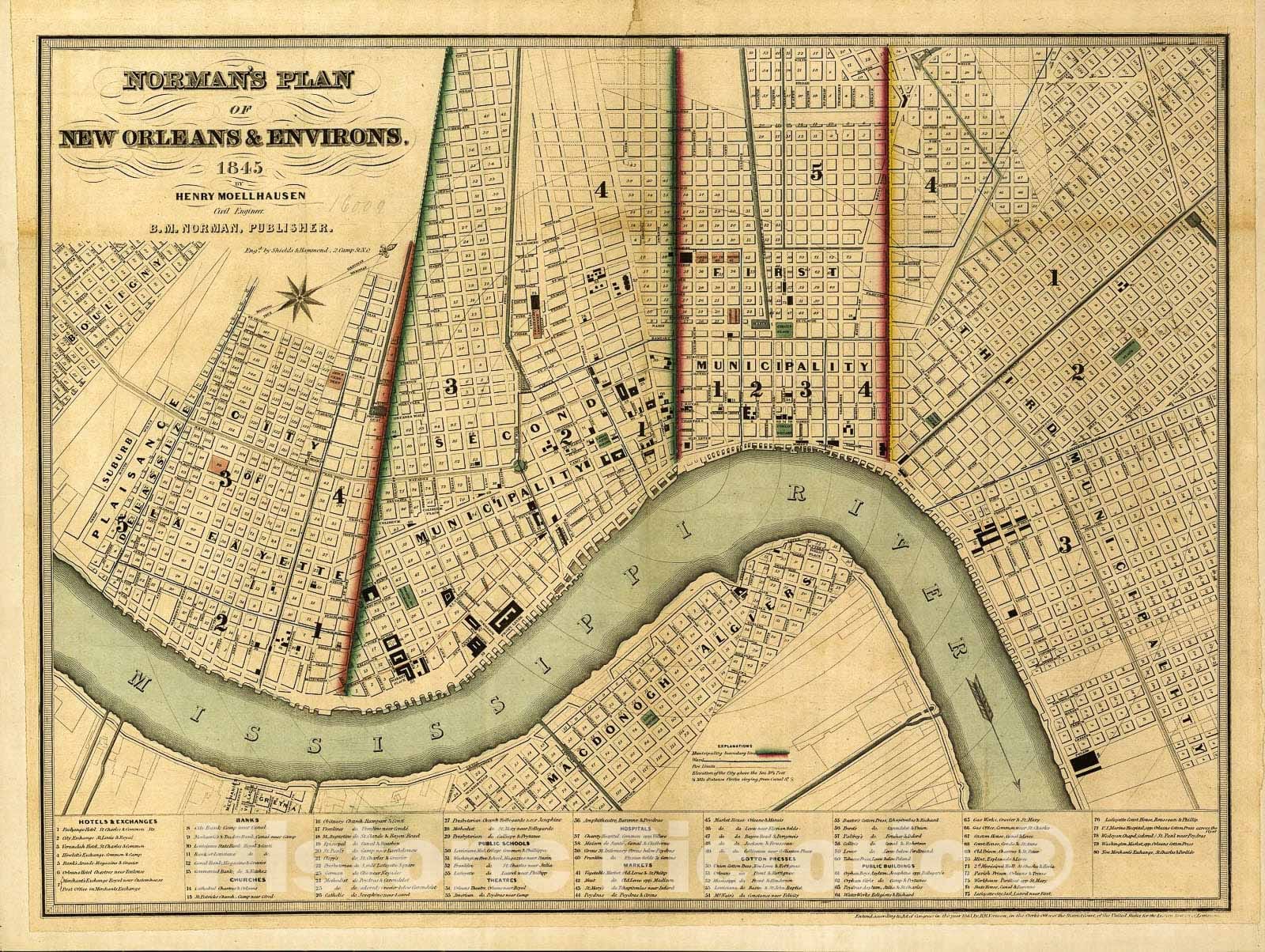 Historic 1845 Map - Norman's Plan of New Orleans & Environs, 1845.