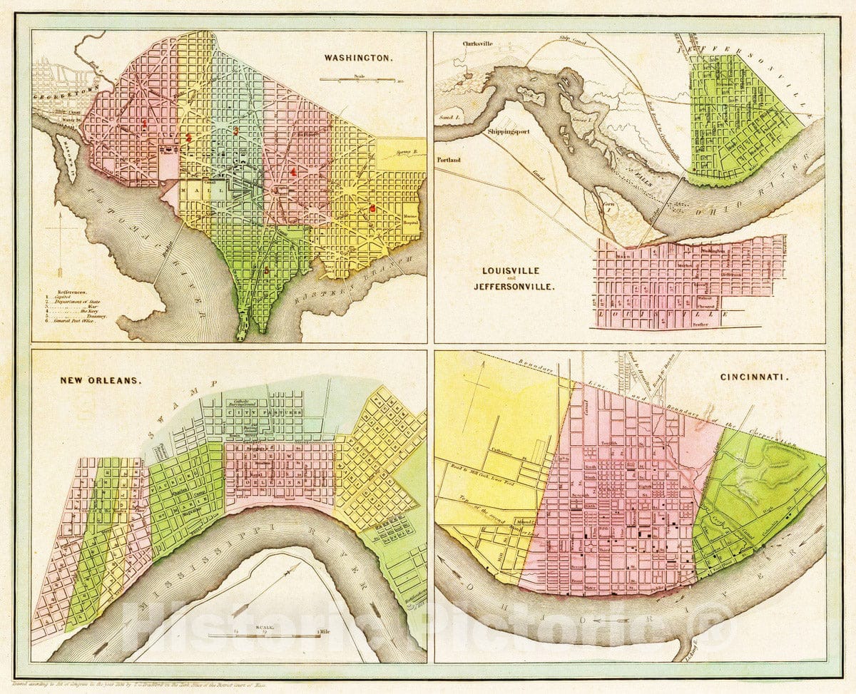 Historic Map : 1841 Washington, Louisville & Jeffersonville, New Orleans, & Cincinatti : Vintage Wall Art