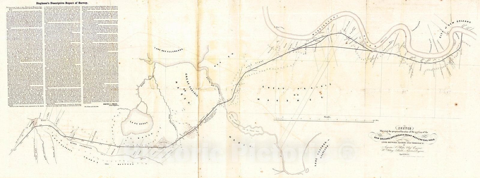 Vintage Map | 1852 Sketch Shewing the proposed location of the portion of the New Orleans, Opelousas, and Great Western Rail Way between Algiers and Thibodaux | Phelps, Augustus and W. Sidney Smith