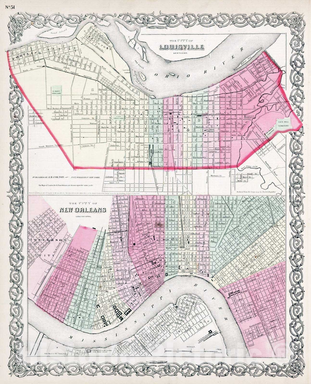 Historic Map : 1865 Louisville, Kentucky. New Orleans, Louisiana. - Vintage Wall Art