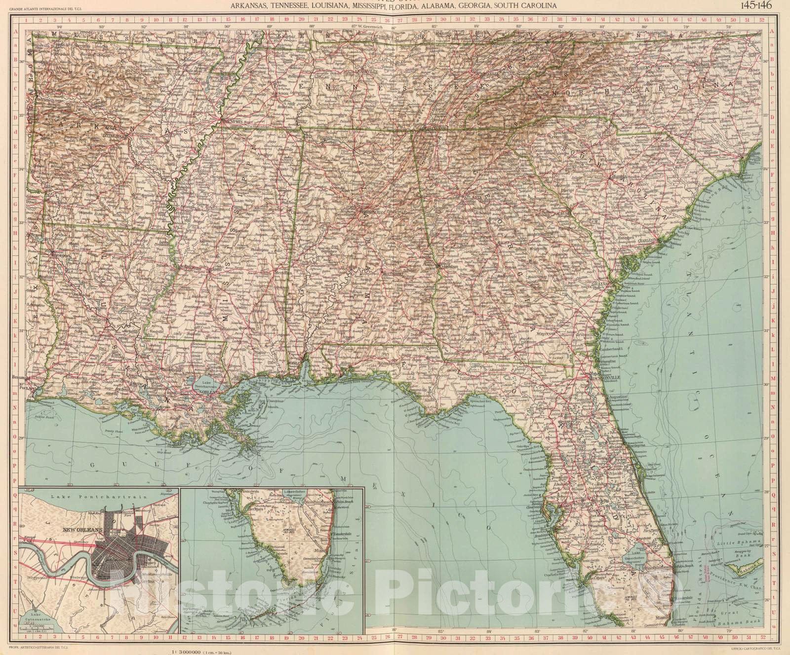 • Historic Map : Arkansas, New Orleans Region (La.) 1929 145-46. Ark, Tenn, La, Miss, FLA, Ala, Ga, S.C. , Vintage Wall Art